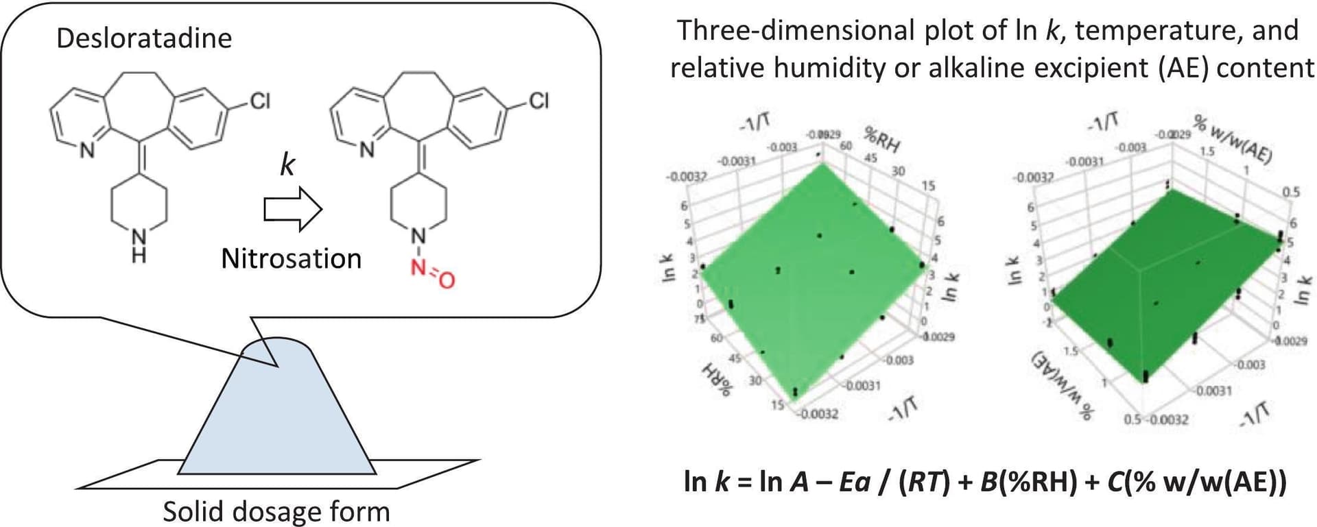 To prevent contamination by nitrosamine drug substance-related impurities (NDSRIs) in solid dosage forms, the modeling of drug nitrosation reactions was investigated. The nitrosation reaction rate of desloratadine (DES) in the physical mixtures (PMs) was measured under various temperature, relative humidity, and alkaline excipient (AE) content conditions. The nitrosation reaction rate increased with increasing relative humidity and temperature. In contrast, an increase in AE content resulted in a decreased nitrosation reaction rate. The relationship between these three conditions and reaction rate was analyzed by multiple regression analysis using the least-squares method. The modified Arrhenius equation was expressed as ln k = 41.38 −13026 × (1/T ) + 0.038 × (%RH) − 0.44 × (% w/w(AE)). The values predicted by the modified Arrhenius equation were in good agreement with the experimental values, indicating that the model equation was valid. The prediction accuracy of the modified Arrhenius equation was higher than that of the original Arrhenius equation. The modified Arrhenius equation can be applied to the nitrosation reactions of various drugs and is expected to improve the quality, safety, and efficiency of drug research, development, and manufacturing processes.