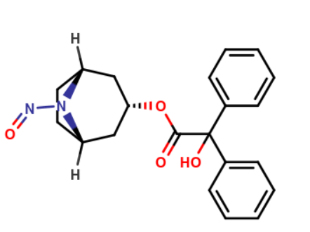 I see the starting material for trospium chloride synthesis—nortropine—and the related impurity B (benzyl acid nortropine ester) as more problematic. Both of these substances are secondary amines. Benzyl acid nortropine ester is actually always < 100 ppm, and I don’t have any analysis values for nortropine itself. However, I actually assume that it is completely converted during API synthesis and therefore does not pose a risk. When I categorize the NDSRI of benzyl acid nortropine ester (see picture below) using the CPCA approach, I end up in potency category 5 because there is only 1 alpha-hydrogen on each side of the N-nitroso group. Have I assessed this correctly? How do you view the general risk posed by this nitrosamine contamination? Based on various publications (Moser et al., 2023 – N-Nitrosamine Formation in Pharmaceutical Solid Drug Products: Experimental Observations; Carloni et al., 2023 – Solid State Kinetics of Nitrosation Using Native Sources of Nitrite) on nitrosamine formation in the solid state, a low single-digit conversion rate is to be expected.