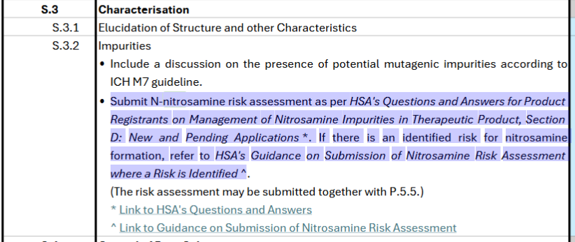 - Guidance document for product registration: https://www.hsa.gov.sg/therapeutic-products/medicines-quality-and-compliance-monitoring/nitrosamine-impurities-in-medicines/guidance-for-product-registrants#:~:text=The%20HSA%20has%20developed%20a%20question-and-answer%20(Q&A),*%20Requirements%20for%20new%20and%20pending%20applications
