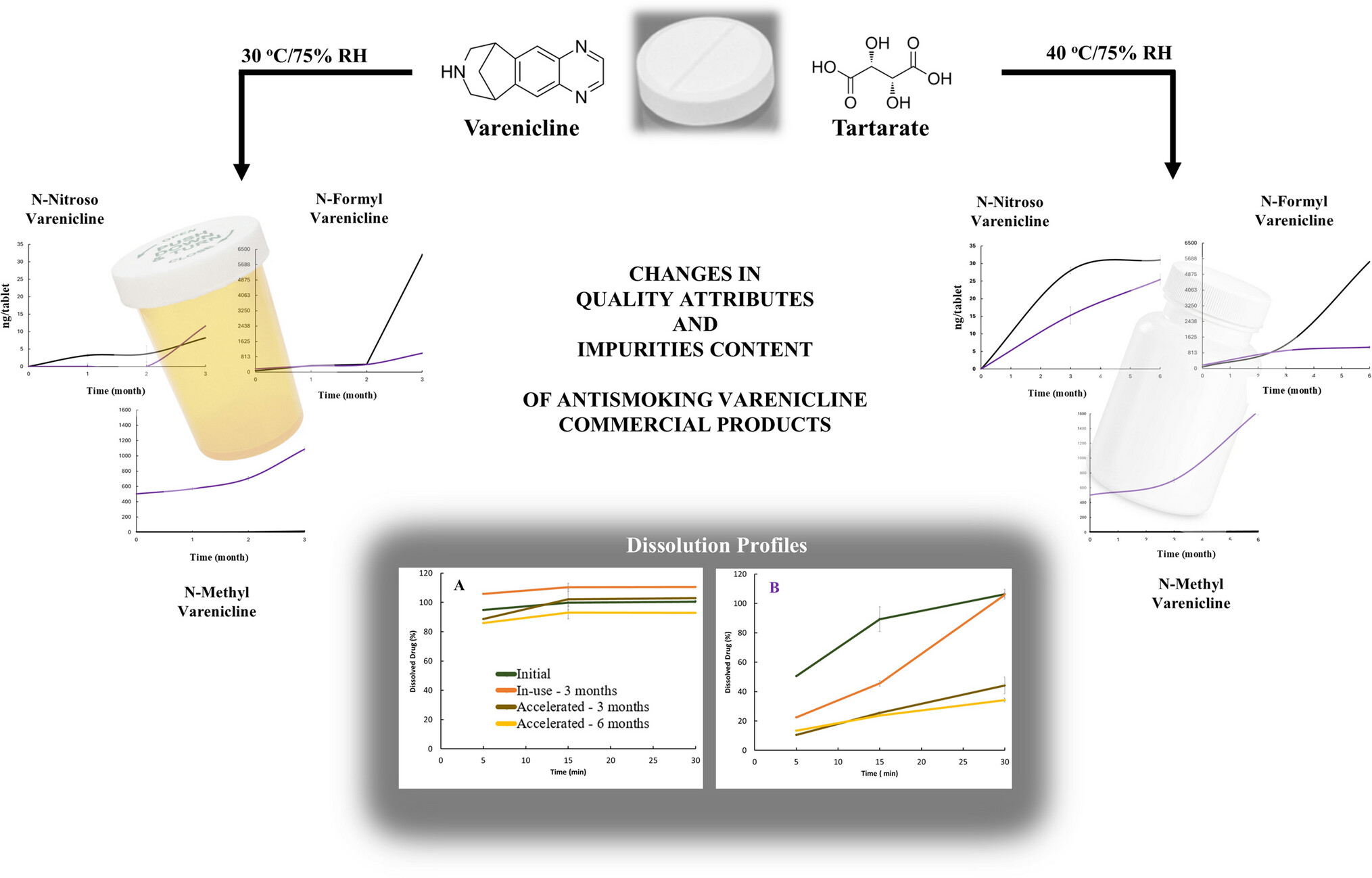 The objectives of the present work were to study the effect of patient-in use and accelerated storage conditions on critical quality attributes (CQAs) of FDA approved varenicline tartrate (VRT) products. Four products (V1, V2, V3 and V4) of VRT were stored at 30 °C/75% RH and 40 °C/75% RH for three and six months, respectively, and tested periodically for nitrite, impurities (N-nitroso varenicline, N-formyl varenicline and N-methyl varenicline), assay, dissolution and solid-state of the drug. Nitrite content decreased while N-nitroso varenicline increased with storage temperature and duration. Initial nitrite value range was 9.3 ± 2.3 to 31.0 ± 9.3 ng/tablet that decreased to 1.7 ± 0.3 to 8.1 ± 5.4 ng/tablet after six months storage at 40 °C/75%. N-nitroso varenicline, N-formyl varenicline and N-methyl varenicline content ranged from 0–31.0 ± 11, 75 ± 9.1 to 5530.0 ± 1.2, and 7.0 ± 0.3 to 1633.2 ± 55.8 ng/tablet after storage, respectively. Polymorphic forms present in V1 and V4 were A and B, respectively, while products V2 and V3 contained amorphous form of the drug. No change in solid state was observed in the products except a decrease in crystallinity of almost 30% after storge. All products completely dissolved > 85% drug in 15 min before storage. V1 and V4 showed no significant change in dissolution while product V2 and V3 showed significant decrease in the dissolution. The dissolved drug was 33.6 ± 0.5 and 34.2 ± 0.7% in 30 min from V2 and V3 after storage, respectively. In summary, tested products showed differential effects of stability conditions on the CQAs and some of the attributes were critically diminished that need further investigation.